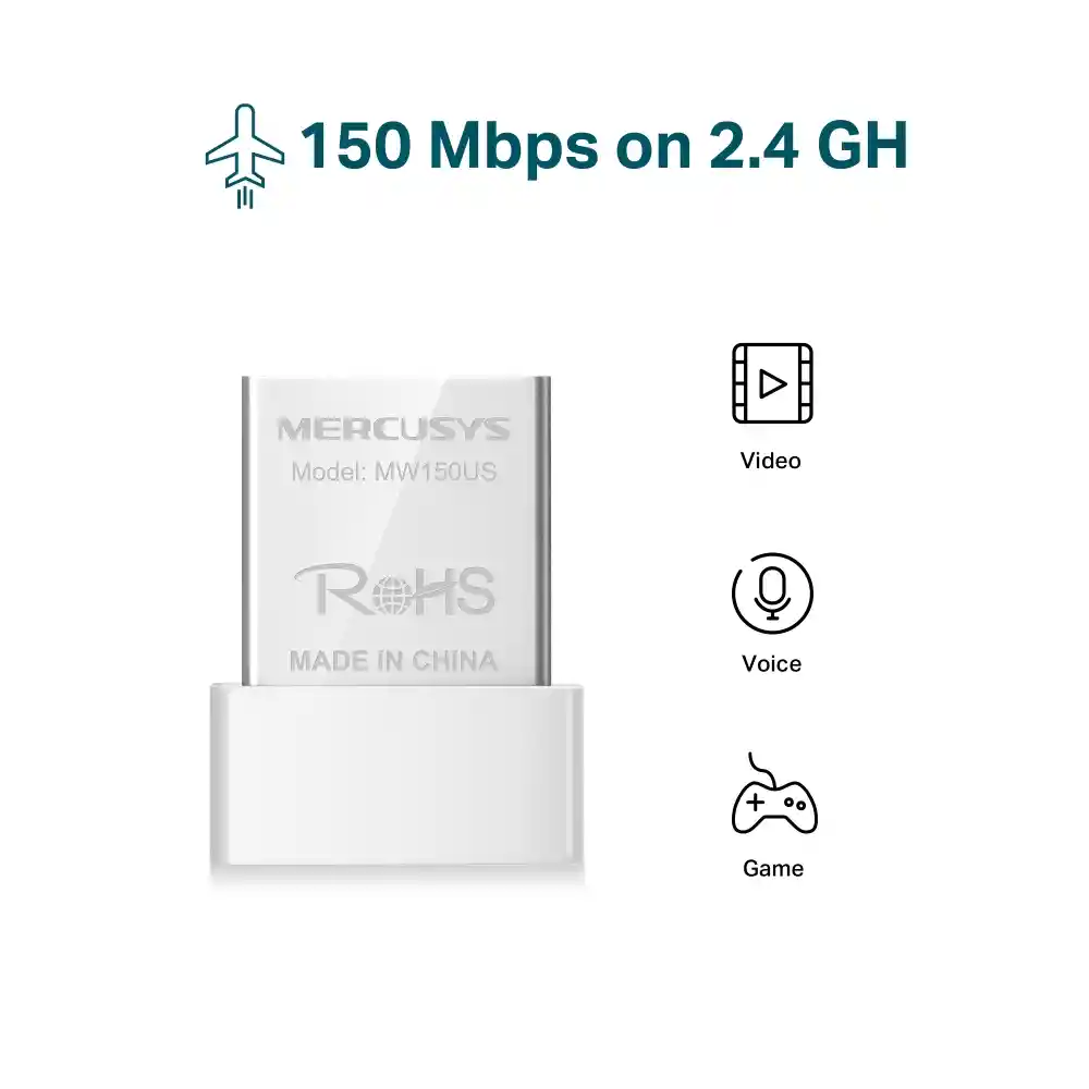 Nano Adaptador Usb Wifi N 150mbps, Mercusys N150 TALLA MINIATURA Con su diseño ultra compacto, el Nano Adaptador Usb Wifi N 150mbps, Mercusys N150 es extremadamente conveniente para el uso en el hogar o en el exterior. Todo lo que necesita hacer es conectar este adaptador en miniatura al puerto USB de una computadora. Entonces puedes dejarlo allí sin ninguna preocupación. VELOCIDAD INALÁMBRICA DE 150MBPS Este adaptador en miniatura puede alcanzar velocidades inalámbricas de hasta 150 Mbps, lo que lo hace ideal para navegar por la web sin problemas, descargas rápidas de archivos y llamadas estables por Internet. CONFIGURACIÓN FÁCIL Una interfaz de usuario amigable en un CD para una instalación simple SISTEMA OPERATIVO Soporta Windows10 / 8.1 / 8/7 / XP CARACTERÍSTICAS • Solución compacta y conveniente para hacer que su dispositivo sea inalámbrico. • Perfecto para aplicaciones esenciales de Internet como navegación web, correo electrónico y chat • Soporta Windows 10 / 8.1 / 8/7 / XP (32 / 64bit) ESPECIFICACIONES • Dimensiones (WXDXH) 0.74 × 0.58 × 0.27 pulg. (18.9 × 14.8 × 6.85 mm) • Tipo de antena Interno • Tasa de señal • 11n: Hasta 150Mbps (Dinámico) • 11g: Hasta 54Mbps (Dinámico) • 11b: hasta 11Mbps (dinámico) • Estándares inalámbricos IEEE 802.11n, IEEE 802.11g, IEEE 802.11b • Frecuencia 2.400 - 2.4835GHz • Sensibilidad de recepción • 130M: -68dBm @ 10% PER • 108M: -68dBm @ 10% PER • 54M: -68dBm @ 10% PER • 11M: -85dBm @ 8% PER • 6M: -88dBm @ 10% PER • 1M: -90dBm @ 8% POR • Interfaces USB 2.0 • Certificaciones CE, ROHS • Ambiente • Temperatura de funcionamiento: 0°C ~ 40°C (32°F ~ 104°F) • Temperatura de almacenamiento: -40°C ~ 70°C (-40°F ~ 158°F) • Humedad de funcionamiento: 10% ~ 90% sin condensación • Humedad de almacenamiento: 5% ~ 90% sin condensación • Poder de transmision 20dBm • Seguridad inalámbrica WEP, WPA / WPA2, WPA-PSK / WPA2-PSK • Requisitos del sistema Windows 8.1 / 8/7 / XP (32 / 64bit) CONTENIDOS DEL PAQUETE • Adaptador Nano USB inalámbrico N150 MW150US • Guía de Instalación Rápida • Resource CD