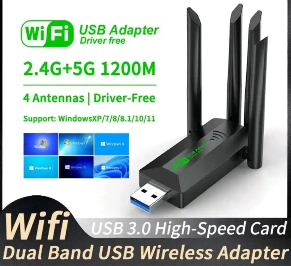 ¡Convierte tu PC o portátil en una máquina de alta velocidad! Adaptador WiFi USB 3.0 de 1200Mbps con 4 antenas de alta ganancia para una señal más estable y potente. ✓Velocidad hasta 1200Mbps (300Mbps en 2.4G + 867Mbps en 5G) ✓Tecnología Doble Banda (2.4GHz y 5GHz) Conexión USB 3.0 más rápida y estable ✓Ideal para streaming, videojuegos online y trabajo remoto ✓Mayor alcance gracias a sus 4 antenas externas ✓Compatible con Windows ✓Di adiós a los cables y mejora tu conexión en segundos. ✓Perfecto para computadores de escritorio que no tienen WiFi o laptops con señal débil. ✓Producto nuevo ✓Envíos a todo el país