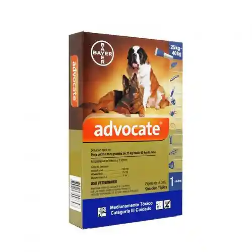 Advocate Perros de 25 Kg a 45 Kg, único producto con dos ingredientes activos que permiten la prevención y tratamiento de parásitos internos y externos en todas sus formas (adultos y larvas). Advocate Perros es el único producto antiparasitario externo e interno en pipetas, registrado para el tratamiento de la sarna en el perro. También usada para el tratamiento y control de pulgas, acaro del oído y parasito del corazón. Se recomienda repetir el tratamiento cada 4 semanas.