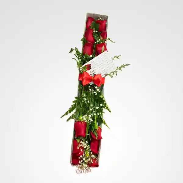 Caja floral elaborado con 12 rosas rojas y fresco follaje compuesto de solidago, gypsophilas y helecho cuero