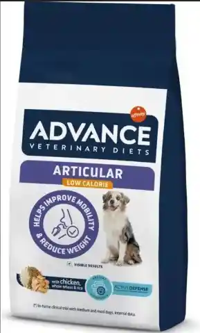Advance Articular Low Calorie es un alimento veterinario diseñado para perros con problemas articulares y sobrepeso. Este producto ayuda a reducir el peso y a preservar la salud y la movilidad articular gracias a su fórmula baja en calorías y contenido de ácido hialurónico, colágeno hidrolizado, condroitina, glucosamina y omega 3. Además, incluye probióticos, prebióticos, fibras e inmunoglobulinas activas que contribuyen a una microbiota intestinal saludable, lo cual es clave para una buena defensa. Se recomienda consultar a un veterinario antes de iniciar la alimentación con este producto.
