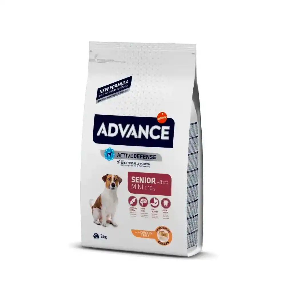 Los perros senior de raza pequeña necesitan un alimento específico a partir de los 8 años de edad que se adapte a sus necesidades nutricionales. ADVANCE Senior Mini es un alimento de alta gama fácil de digerir formulado para cubrir sus necesidades específicas que facilita el correcto funcionamiento de sus defensas y barreras naturales. Gracias a su fórmula exclusiva ADVANCE, ayuda a preservar el cartílago articular, la masa muscular, la salud intestinal, la salud dental y la actividad cognitiva con la edad. Además, ADVANCE Senior Mini contiene taurina, un aminoácido que contribuye al buen funcionamiento del corazón.