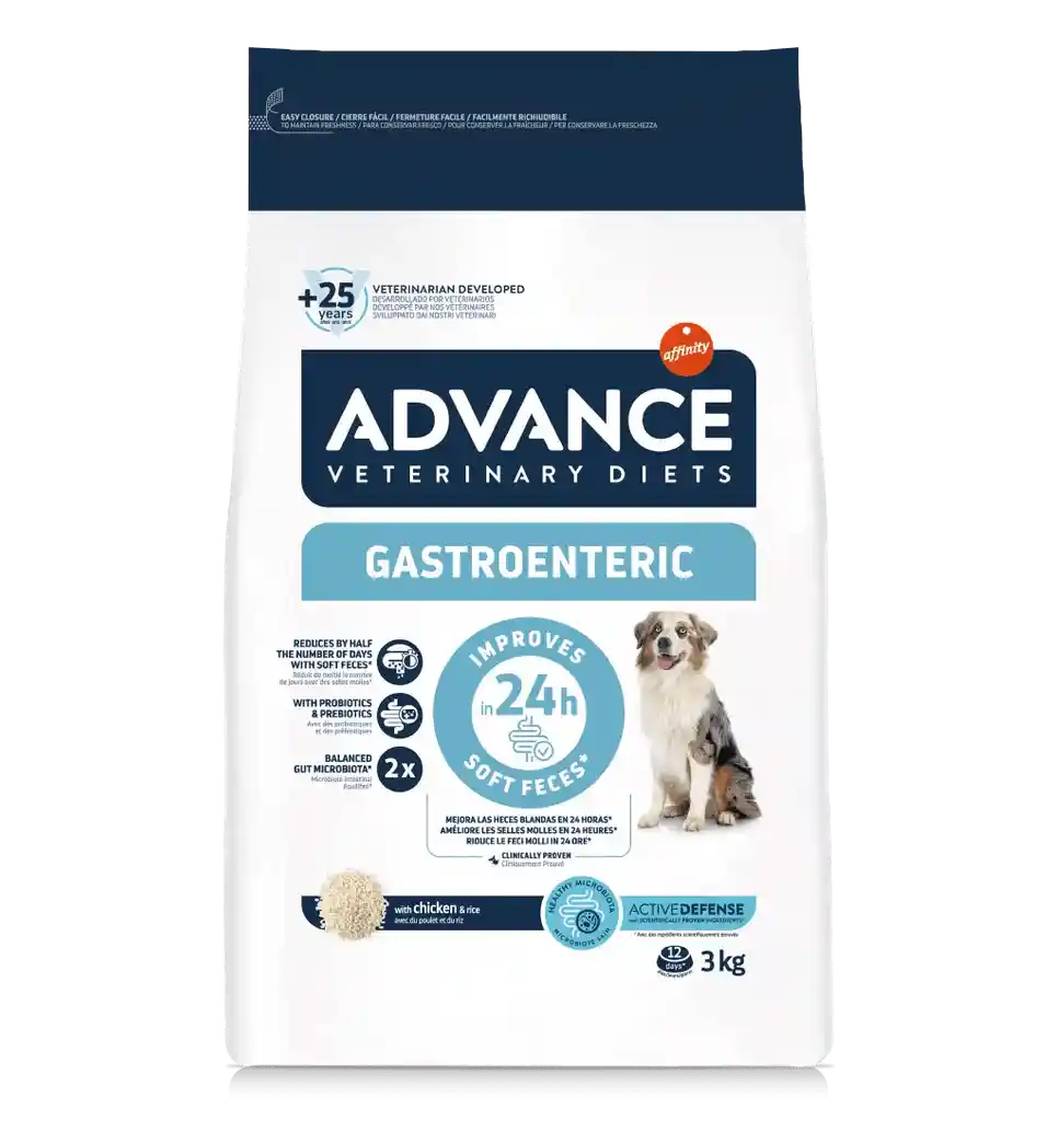 ADVANCE VETERINARY DIETS Gastroenteric es un alimento dietético completo para cachorros y perros adultos, elaborado con ingredientes muy digestibles, nivel bajo de grasa y una mayor proporción de sodio y potasio, para ayudar a reducir ciertas alteraciones gastrointestinales y para casos de insuficiencia pancreática exocrina. Su contenido en probióticos y prebióticos contribuyen a mejorar la microbiota intestinal y a reforzar la barrera del intestino. Su fórmula es muy digestible para facilitar la absorción de nutrientes esenciales. Los resultados de ADVANCE VETERINARY DIETS Gastroenteric están clínicamente probados: mejora las heces blandas en 24 horas y reduce la frecuencia de las deposiciones en 48 horas. Con ADVANCE VETERINARY DIETS Gastroenteric el riesgo de sufrir disbiosis es 2 veces menor.* ADVANCE VETERINARY DIETS Gastroenteric contiene probióticos, prebióticos e inmunoglobulinas activas que contribuyen a tener una microbiota intestinal saludable lo cual es clave para unas buenas defensas.