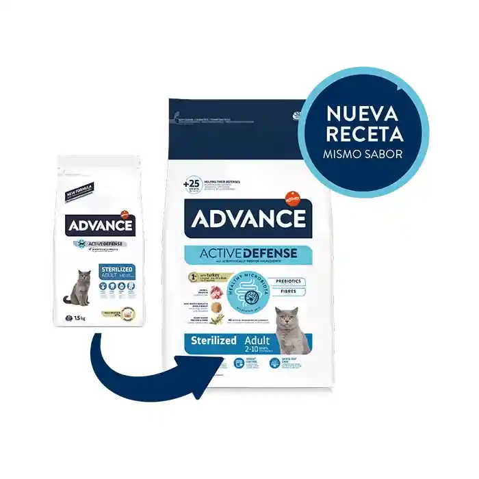 Advance Sterilized Adult es una sabrosa receta de alta calidad que cubre las necesidades de los gatos adultos esterilizados. Está elaborada con pavo como primer ingrediente, es fácil de digerir y ayuda a mantener un peso ideal gracias a su contenido en proteínas y calorías. También contribuye a controlar el pH urinario, y al cuidado de la piel y el pelo gracias a los ácidos grasos omega 3 y omega 6, y al zinc. El tamaño de su croqueta se adapta a la mandíbula de los gatos adultos.