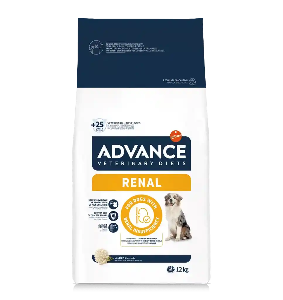 ADVANCE VETERINARY DIETS RENAL es un alimento dietético completo para perros adultos, con un nivel limitado de proteínas, pero de alta calidad y con un bajo contenido en fósforo. Está especialmente indicado para apoyar el funcionamiento del riñón en caso de insuficiencia renal crónica. Su contenido en fibra soluble disminuye la excreción de nitrógeno por el riñón y sus niveles moderados de proteína y sodio ayudan a la correcta función renal.