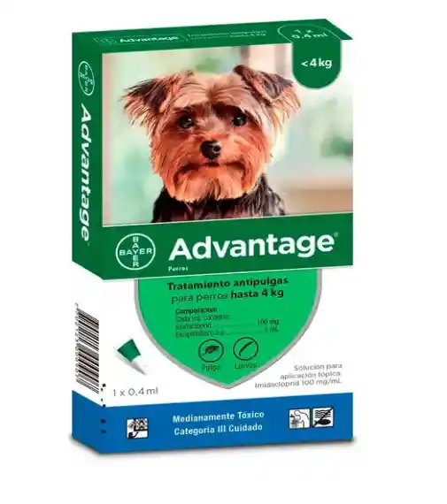 Pulguicida Solución tópica Composición Imidacloprid 10 % Excipientes c.s.p. 100 % Descripción • Advantage® Perros es un pulguicida de acción tópica. • Es el más revolucionario de los pulguicidas desarrollado exclusivamente por Bayer. Es una solución tópica (spot–on), que elimina efectivamente las pulgas y piojos. Actúa contra reinfestaciones eficazmente al 100%,durante cuatro semanas, resistiendo en el mismo periodo los baños y el shampoo • Después de la aplicación, la grasa natural del pelaje y los movimientos del animal distribuyen la solución sobre toda la superficie corporal, eliminando el 100 % de las pulgas durante las primeras 12 horas. • Con su acción residual y larvicida protege al perro contra nuevas infestaciones de pulgas durante un mes. • Debido a sus propiedades lipofílicas permanece efectivo aún después del baño. • Su amplio margen de seguridad, permite, además el contacto directo del amo con la mascota inmediatamente después de aplicar Advantage® Perros. Indicaciones Advantage® Perros está indicado en el tratamiento y control de infestaciones de pulgas (Ctenocephalides spp) en perros. Modo de aplicación • Para uso externo únicamente. • Advantage viene formulado y envasado para aplicarse fácilmente mediante pipetas con la cantidad necesaria para cada rango de peso, identificados convenientemente por colores • Separe el pelo de la parte posterior de la nuca y aplique todo el contenido de la pipeta directamente sobre la piel. Dosificación • Una pipeta de Advantage® Perros tiene un efecto de 4 semanas. Transcurrido este período debe repetirse el tratamiento.