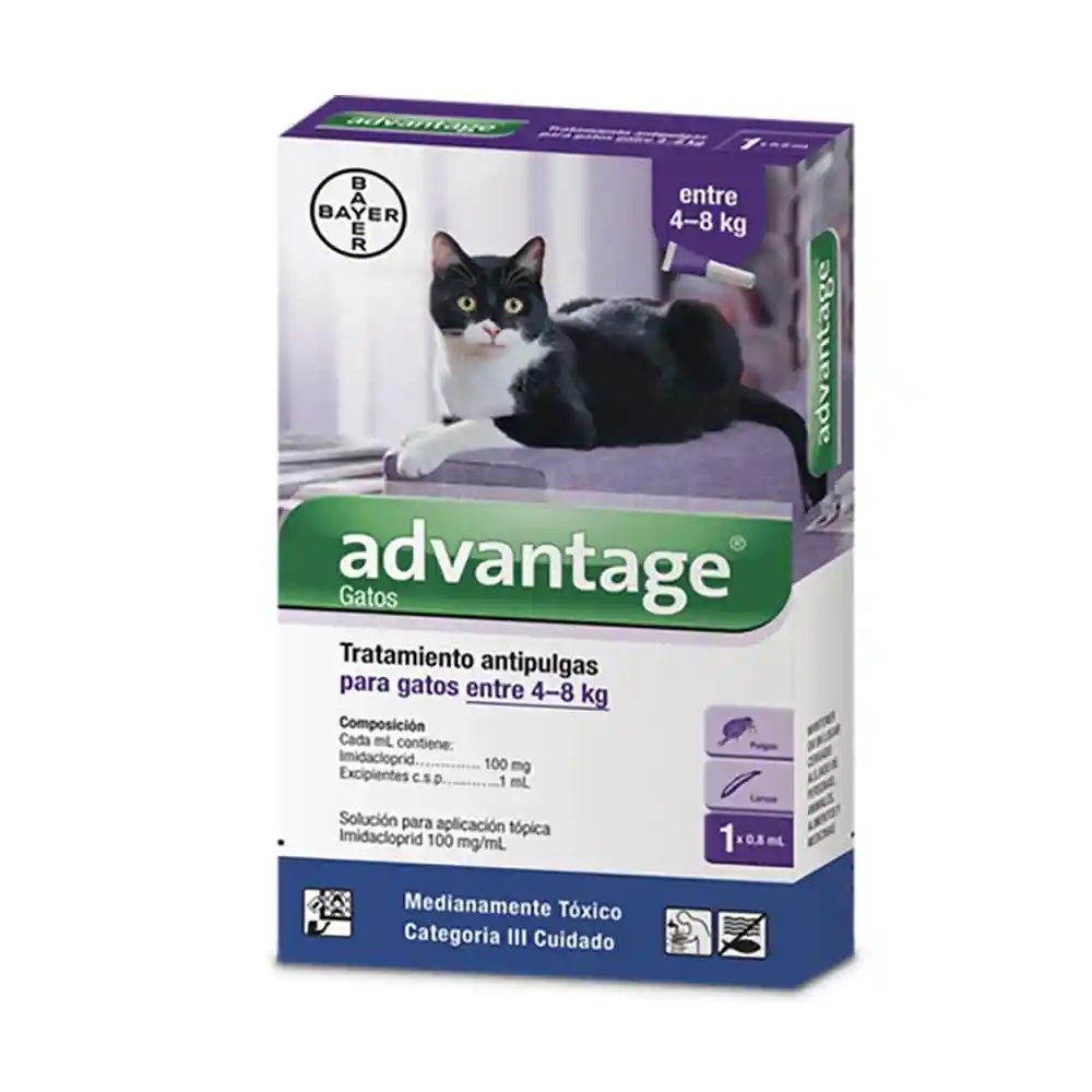 Presentacion Advantage®Gatos, pipeta de 0.4ml, para gatos hasta 4 kg de peso.Gatos pipeta de 0.8 ml, para Gatos de 4 a 8 kg.Advantage® Gatos es un pulguicida de acción tópica.Después de la aplicación, la grasa natural del pelaje y los movimientos del animal distribuyen la dosis sobre toda la superficie corporal, eliminando el 100 % de las pulgas durante las primeras 12 horas.Con su acción residual y larvicida protege al gato contra nuevas infestaciones de pulgas durante un mes, aun en condiciones de desafío como los baños, shampoo, ambientes infestados y contacto con otros animales no tratados.Su amplio margen de seguridad, permite, además el contacto directo del amo con la mascota inmediatamente después de aplicar Advantage® Gatos. Indicaciones Advantage® Gatos está indicado en el tratamiento y control de infestaciones de pulgas (Ctenocephalides spp.) en gatos. Modo de AplicaciónPara uso externo únicamente.Separe el pelo de la parte posterior de la cabeza y aplique todo el contenido de la pipeta directamente sobre la piel. DosificaciónUna pipeta de Advantage® Gatos tiene un efecto de 4 semanas. Transcurrido este período, debe repetirse el tratamiento.A pesar de que no se observen pulgas en el animal, se recomienda realizar tratamientos mensuales para un óptimo control. PrecauciónMantener fuera del alcance de los niños.No posee antídoto específico, se debe realizar tratamiento sintomático.