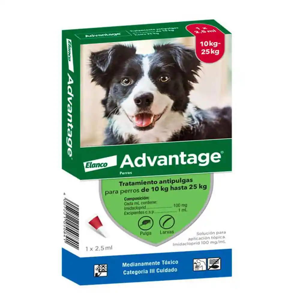 Puede aplicarse a cachorros a partir de las 8 semanas de edad. Debes aplicar directamente sobre la piel de tu mascota la totalidad de la pipeta distribuida en 4 puntos dorsales. El tiempo de efectividad del producto es de 4 semanas por lo cual se recomienda repetir la medicación al cabo de este tiempo. Manténgase fuera del alcance de los niños. Advantage perros viene en cuatro presentaciones por colores según el peso de la mascota: pipeta por 0.4 ml para perros hasta 4 kg de peso, pipeta por 1.0 ml para perros a partir de 4 kg a 10 kg de peso, pipeta por 2.5 ml para perros a partir de 10 kg a 25 kg de peso., pipeta por 4.0 ml para perros a partir de 25 kg a 40 kg de peso. Ideal para perros entre 10 y 25 kg de peso. Con toxicidad moderada. Cuidado categoría III.