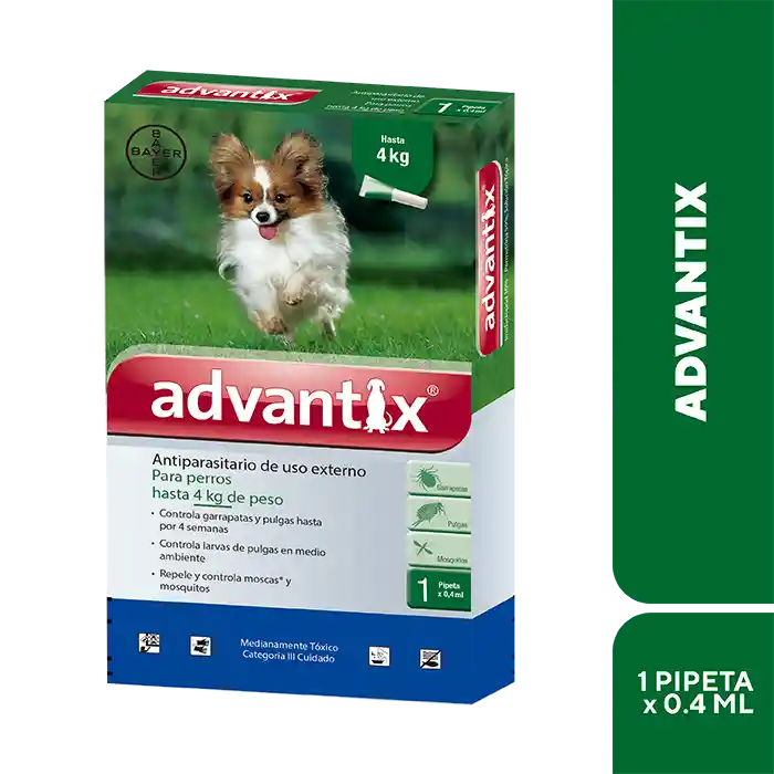Antiparasitario Advantix Perros Hasta 4 Kg. Elimina Pulgas. Garrapatas y Piojos Masticadores, Además, es un Extraordinario Repelente Contra Garrapatas, Flebotomos, Los Mosquitos Transmisores de la Leishmaniosis, Mosquitos y Moscas de Establos