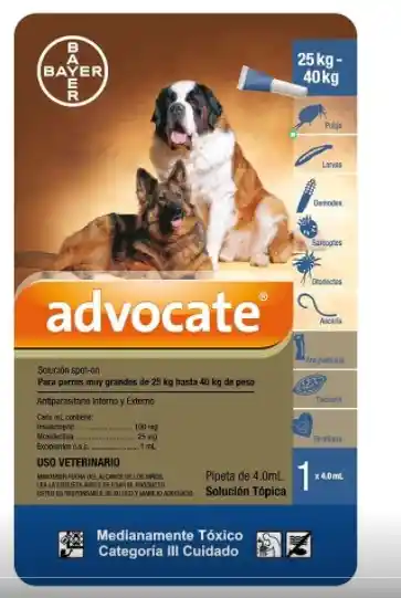 Advocate de Bayer es un antiparasitario interno y externo para perros de uso externo. Su pipeta debe aplicarse una vez por mes para mantener a tu perro con mayor protección. Está formulado para actuar en contra de parásitos externos e internos causantes de la demodicosis, sarna sarcóptica, dirofilariasis o enfermedad del gusano en el corazón, infestaciones por nematodos gastrointestinales, infestaciones de pulgas y ácaro del oído, entre otras.