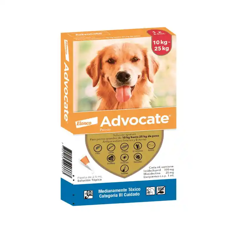 Composición Imidacloprid 100 mg + Moxidectina 25 mg + Excipientes c.s.p. 1 mL Descripción Advocate Perros es usado en caninos para el tratamiento y control de las pulgas Ctenocephalides sp., tratamiento de la infestación por el ácaro del oído Otodectes cynotis, tratamiento de la demodicosis causada por Demodex canis, sarna sarcóptica por Sarcoptes Scabiei var. canis, control de la infestación por el parásito del corazón Dirofilaria immitis, larva L3 y L4, tratamiento de las infestaciones por nemátodos gastrointestinales: larva L4, adultos inmaduros y adultos de Toxocara canis, Ancylostoma caninum y Uncinaria stenocephala y adultos de Toxascaris leonina y Trichuris vulpis. Modo de aplicación Tópico Spot On, solución externa. Una pipeta de Advocate® Perros tiene un efecto de 4 semanas. Transcurrido este periodo, debe repetirse el tratamiento cada mes.