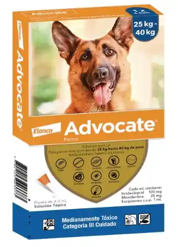 ADVOCATE PERROS DE 25-40 KL .Antiparasitario interno y externo, activo frente a pulgas, Demodex, Sarcoptes, ácaros del oído, gusanos del corazón, Toxocara, Ancylostoma, Trichuris, Angiostrongylus y piojos. Presentación: 4 ml. Antiparasitario interno y externo, activo frente a pulgas, Demodex, Sarcoptes, ácaros del oído, gusanos del corazón, Toxocara, Ancylostoma, Trichuris, Angiostrongylus y piojos.