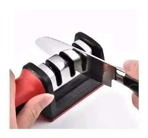 Afilador de Cuchillo Doble Lado, Con 3 Niveles, Mango Plástico de Alta Calidad, Color Rojo.