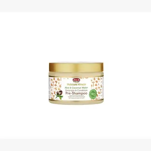 African Pride Pre Shampoo Moisture Miracle Desenredar y acondicionar BENEFICIOS Esta mezcla humectante y desenredante utiliza los beneficios naturales del aloe vera y el agua de coco para acondicionar, proteger y eliminar los enredos de los rizos y rizos naturales: dejando el cabello suave y fácil de manejar durante la limpieza y el peinado. CÓMO USARLO Antes de la limpieza, aplicar una cantidad generosa sobre el cabello seco y distribuir uniformemente. Use los dedos o un peine para desenredar, enjuague bien. Para cabello especialmente seco o enredado, dejar actuar entre 15 y 30 minutos antes de enjuagar. Siga con el Shampoo Moisture Miracle Nourish & Shine . INGREDIENTES DESTACADOS Aloe Vera, Agua de Coco