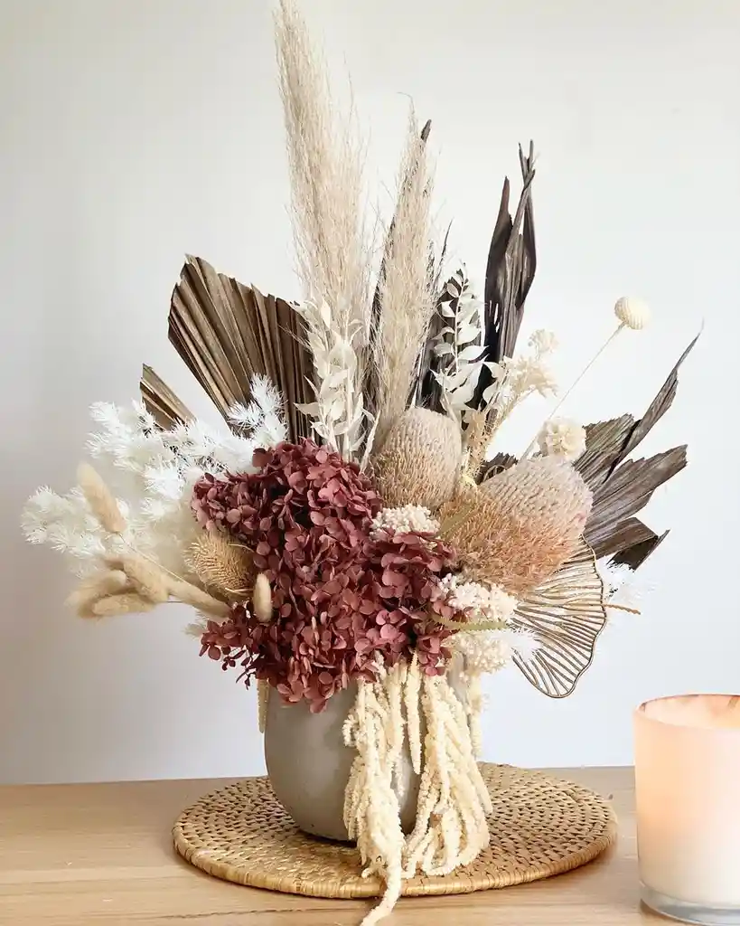 Inspirado en la belleza atemporal, Afrodita es una pieza de lujo con carácter escultórico. Un diseño que mezcla lo orgánico con lo sofisticado en una composición que perdura en el tiempo. Elaborado con hortensias preservadas, pampas, banksias, flores secas, hojas de palma deshidratadas y elementos naturales texturizados en tonos tierra. Es más que un arreglo, es una pieza decorativa de alto nivel, perfecta para espacios exclusivos y clientes que valoran lo diferente, lo eterno y lo exquisito