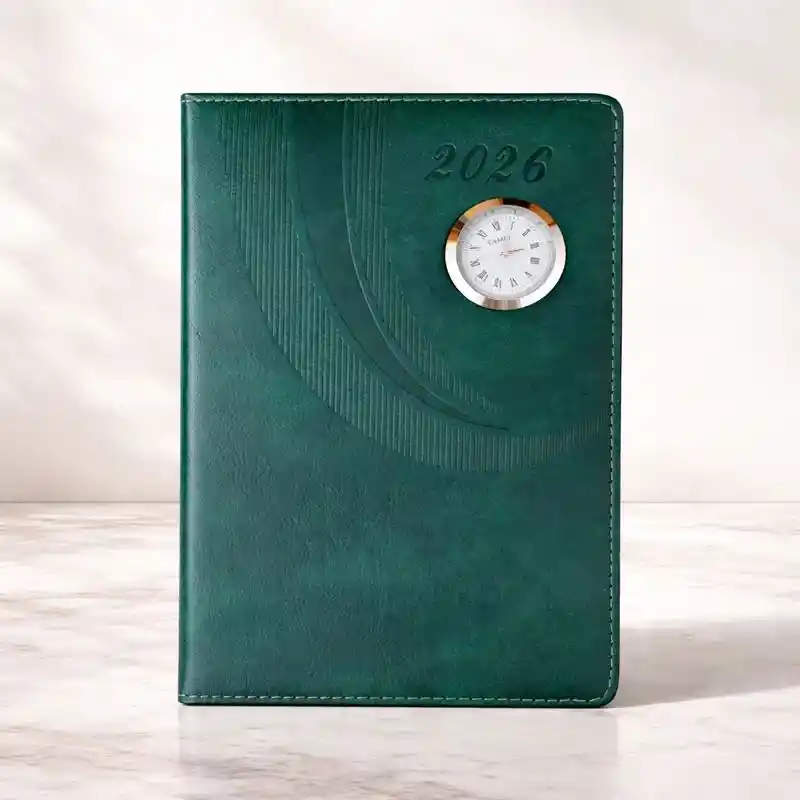 Agenda Ejecutiva 2026 con Reloj Integrado Incluye: 1 agenda Año: 2026 Tamaño: 14,5 cm x 21 cm Tipo: Agenda ejecutiva Formato: Una página por día Pasta: Dura resistente Detalle especial: Reloj analógico integrado en la portada Características: - Diseñada para acompañarte durante todo el año en tus actividades personales, académicas y laborales. - Reloj analógico incorporado en la portada, un detalle funcional y elegante que te permite consultar la hora rápidamente mientras planificas tu día. - Diseño moderno y elegante, con pasta dura resistente que garantiza mayor durabilidad y protección del contenido. Uso recomendado: Ideal para el uso diario en la oficina, el hogar o la universidad. Su tamaño práctico permite transportarla fácilmente en bolsos o mochilas. ¡Una agenda funcional, elegante y con reloj integrado que te ayudará a mantener tu tiempo y tu año perfectamente organizados!
