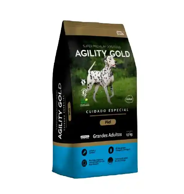 Alimento seco super premium diseñado para perros adultos de razas grandes con cuidado especial de piel y pelaje. Su fórmula nutritiva combina ingredientes de alta calidad como salmón y cordero, aportando proteínas altamente digestibles que favorecen un pelo fuerte, brillante y saludable. Enriquecido con ácidos grasos esenciales (Omega-3 y Omega-6) y vitaminas del complejo B, este alimento ayuda a mantener la piel hidratada y elástica, combatir la sequedad y promover una queratinización adecuada del pelaje. Además, contiene antioxidantes naturales y minerales orgánicos que refuerzan el sistema inmunológico y apoyan la salud general del perro.