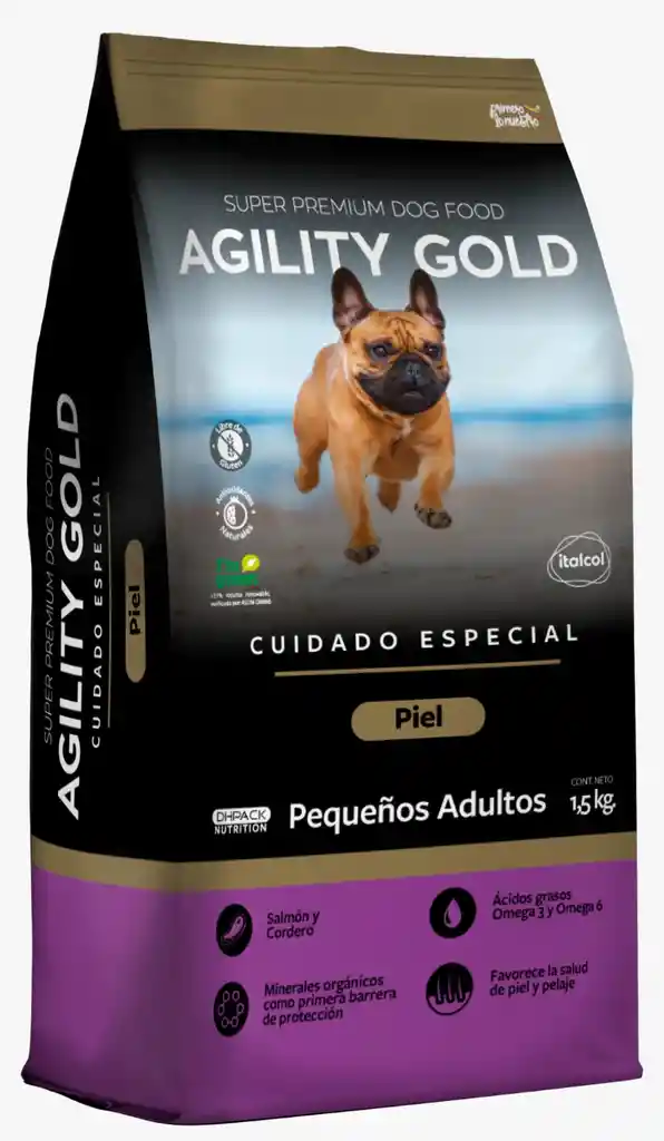 Alimento seco premium para perros adultos de razas pequeñas, formulado para apoyar la salud de la piel y el pelaje. Contiene nutrientes y ácidos grasos esenciales que ayudan a mantener una piel sana y un pelaje brillante, con nutrición balanceada y alta palatabilidad.