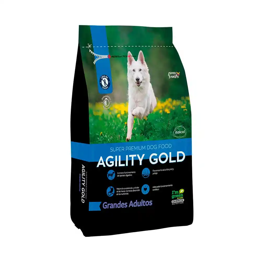 Agility gold grandes adultos es un alimento súper premium diseñado para perros de razas grandes, enfocado en el cuidado de piel, pelaje y articulaciones. Su fórmula libre de granos incluye carne real (salmón/cordero), prebióticos para digestión, taurina para el corazón y ácidos grasos EPA/DHA. Ofrece alta palatabilidad y soporte muscular.