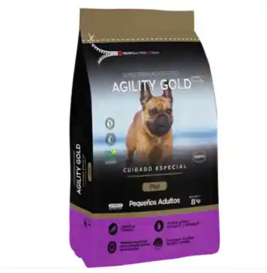 Agility Gold - Piel Pequeños Adultos, es un alimento de alta calidad con utilización de algas marinas para potencializar acciones en la hidratación de la piel y aceites botánicos de Romero que evitan el envejecimiento celular dando fuerza y brillo al pelaje.