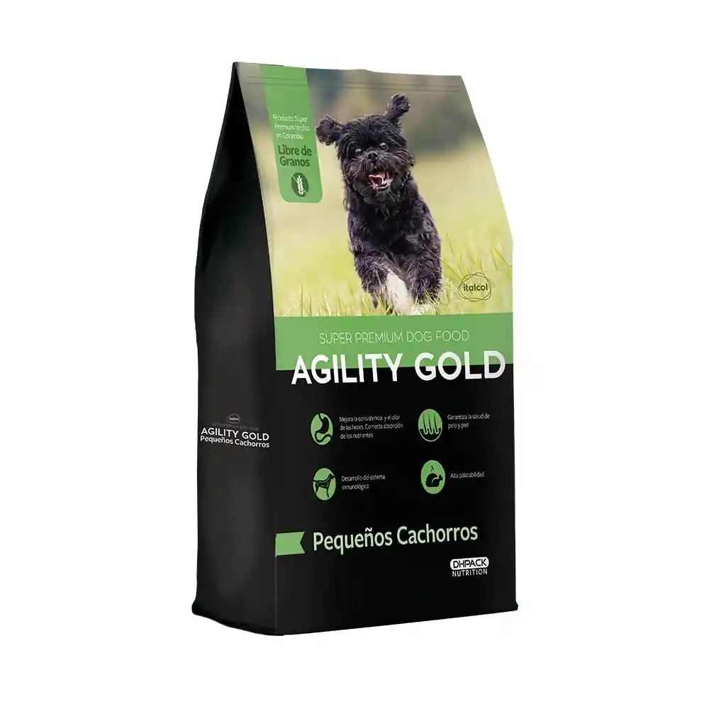Agility Gold es una línea de concentrados para perros super premium fabricada en colombia que proporcionará todos los nutrientes para contribuir a una nutrición sana y balanceada. Su fórmula especialmente diseñada para cachorros de razas pequeñas es libre de granos para asegurar una sana digestión. Es un alimento para perros muy palatable gracias a su rico sabor proveniente de proteína real. Su fórmula contiene niveles de proteínas, vitaminas y minerales balanceados y aptos para asegurar una buena digestión y un sistema inmunológico fuerte. Gracias a los ácidos grasos presentes en su fórmula, este concentrado ayudará a mantener una piel y un pelaje saludable.