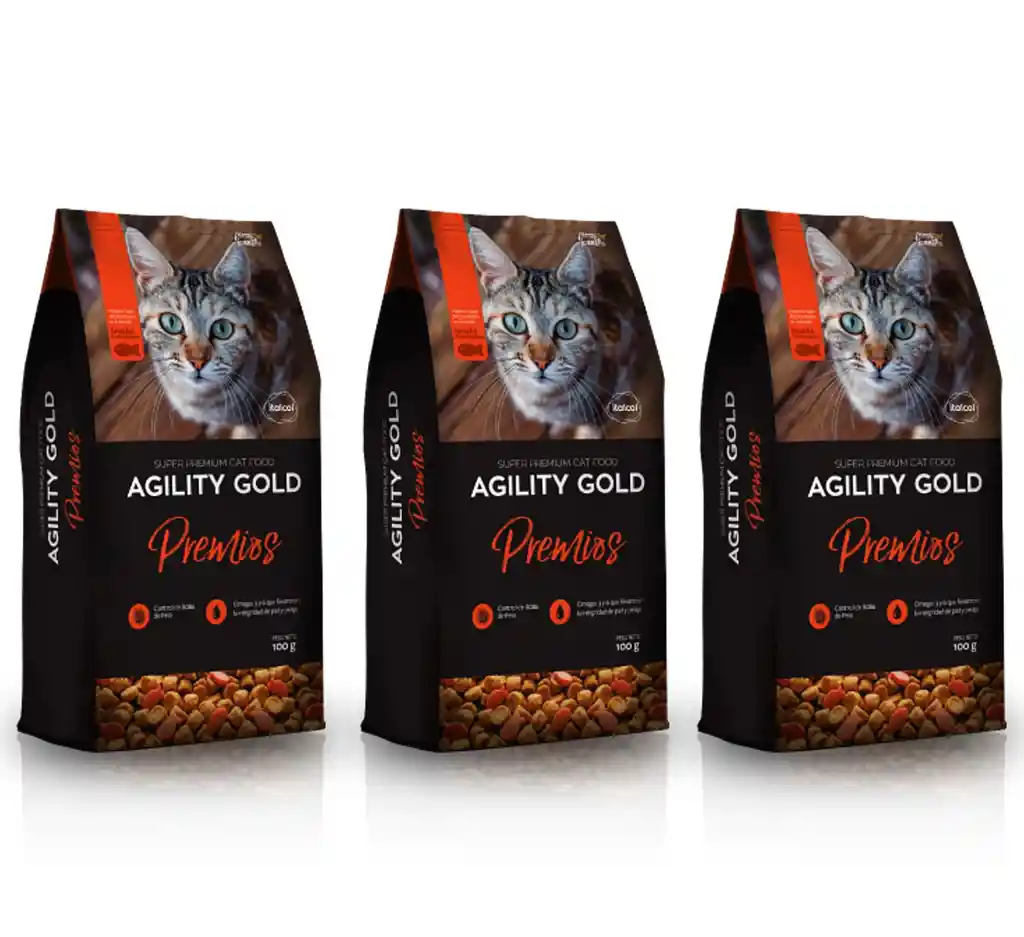 "Agility Gold Premios Para Gatos Snack en presentación de galletas horneadas artesanalmente BENEFICIOS - Con vitaminas que dan brillo y fuerza al pelaje - Ayuda a mantener una piel humectada, ya que contiene ácidos grasos esenciales omega 3 y 6 - Con antioxidantes naturales ANÁLISIS GARANTIZADO Proteína Mínimo 20% Grasa Mínimo 10% Fibra cruda Máximo 4% Humedad Máximo 10% Cenizas Máximo 4% INGREDIENTES Pollo, salmón, harina de trigo, cordero, extracto de té verde, celulosa, cloruro de sodio, vitamina E tocoferol acetato, vitamina A retinol, vitamina B1 tiamina, vitamina B2 riboflavina, vitamina B3 niacinamida, vitamina B5 ácido pantoténico, vitamina B6 piridoxina, vitamina B9 ácido fólico, vitamina B12 cianocobalamina, vitamina H biotina, vitamina K3 menadiona, vitamina D3 colecalciferol, taurina, sulfato de zinc, sulfato ferroso, carbonato de calcio, sulfato de cobre, sulfato de manganeso, selenito de sodio, tocoferoles y aceite de romero como conservantes. Presentación: 3 unidades de 100 gr cada una Somos Todoen.co ¡De todoen Mascotas! /\ _ /\ =^_^= ("""") ("""") = Da clic en COMPRAR AHORA"