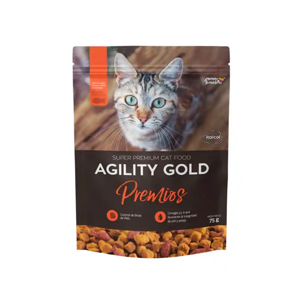 Agility Gold Premios gatos es un snack Funcional con alta palatabilidad gracias a la inyección de carnes(Pollo, Salmón y Cordero), con un balance de fibras ideal que apoya la eliminación de bolas de pelo, suplementado con Vitaminas del complejo B y Omegas 3 y 6 que promueven una piel hidratada y un pelo brillante.