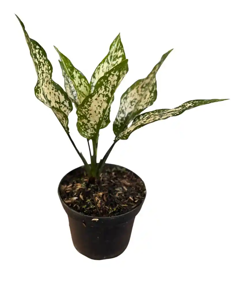 Aglaonema Copo de Nieve en maceta de 10cm de alto. Le gusta vivir en un sustrato ligeramente húmedo y con luz solar indirecta.
