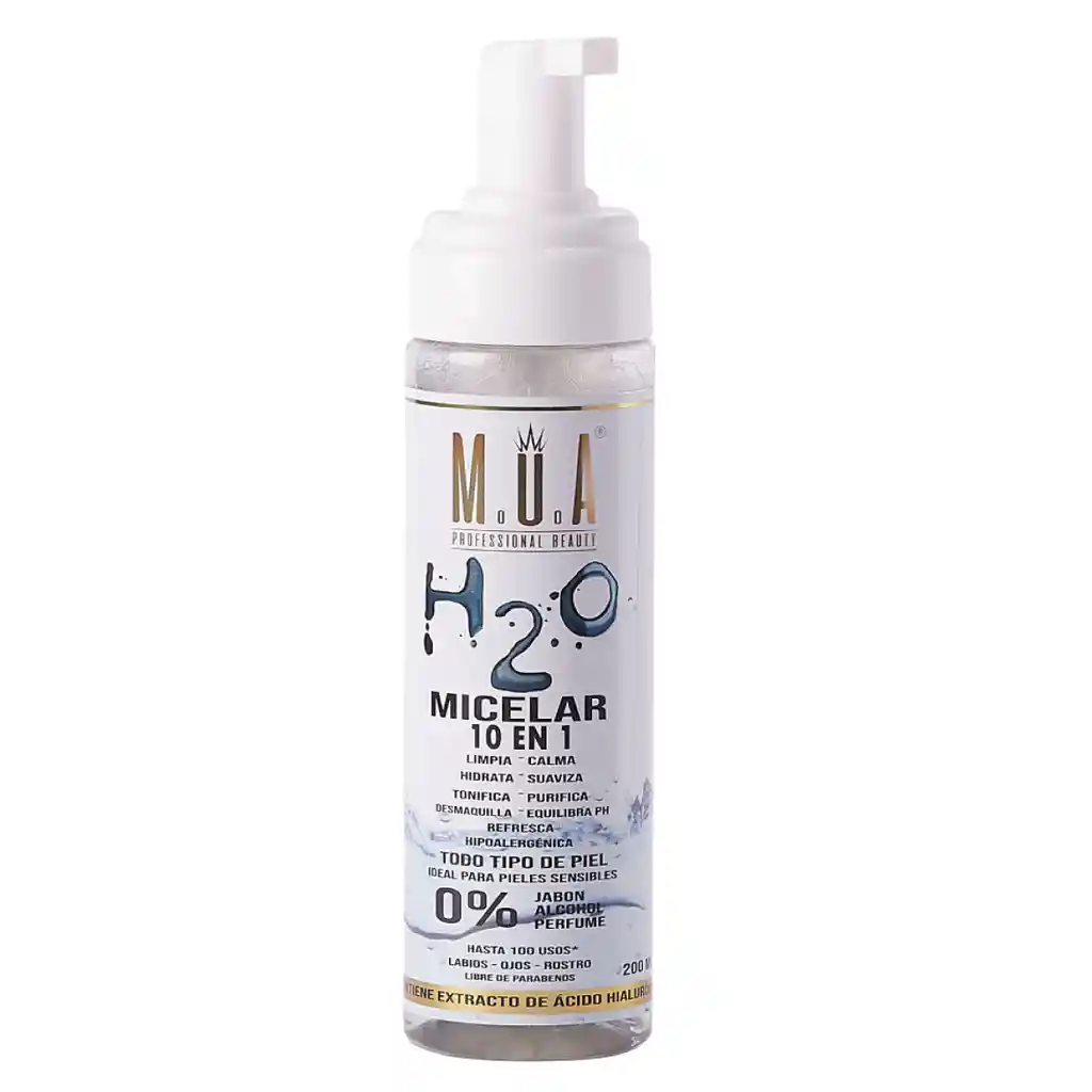H2O MICELAR M.U.A es una solución de moléculas (micelas) que actúan como un imán en la piel atrayendo la suciedad, remueve el maquillaje sin resecar la piel ya que es libre de alcohol, ayuda a mejorar la eficacia de cualquier tratamiento cosmético que uses después. Equilibra el ph de la piel No necesita enjuague. No deja sensación grasa. Tiene propiedades calmantes y refrescantes. El ácido hialurónico que contiene, ayuda a mantener la piel hidratada y funciona como retenedor de hidratación en la piel. Contiene Árnica, Aceite de Coco, Aceite de Jojoba, Caléndula y Fructosa. REMUEVE EL MAQUILLAJE A PRUEBA DE AGUA. 0% JABÓN, 0% ALCOHOL, 0% PERFUME. Apta para pieles sensibles, Desmaquilla ojos, rostro y labios.