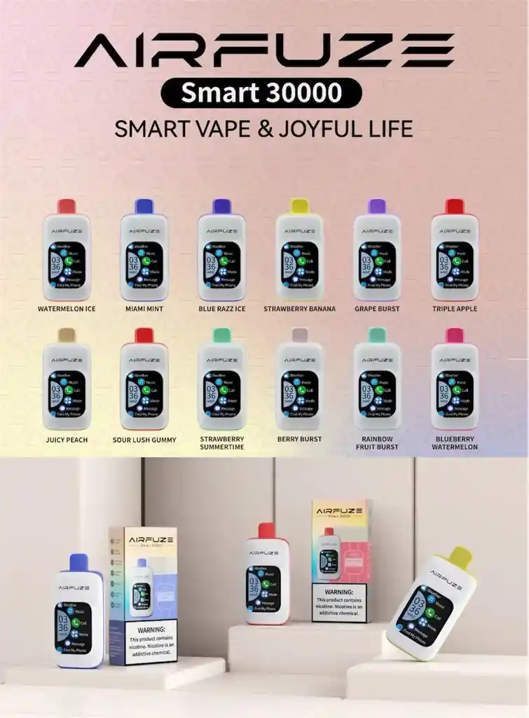 🔥 AIRFUZE 30.000 Puffs 🔥 📩 Escríbenos por el chat de Rappi o a nuestro WhatsApp +573024418058 para elegir tu sabor favorito 💬💜 Dispositivo desechable de larga duración, con sabor intenso y vapor constante 😮‍💨✨ Ideal para uso diario. 🍭 SABORES DISPONIBLES - Rainbow Fruit Burst 🌈🍓 - Grape Burst 🍇💥 - Strawberry Banana 🍓🍌 - Blueberry Watermelon 🫐🍉 - Strawberry Summertime 🍓🌞 - Sour Lush Gummy 🍬🍋 - Berry Burst 🍓💥 - Watermelon Ice 🍉❄️ - Juicy Peach 🍑💦 📲 Funciones destacadas 🔹 Conexión Bluetooth 🔹 Incluye parlante para música 🎶 🔹 Niveles de vapeo ajustables 🔹 Juegos integrados 🎮 🔹 Conexión con apps para mensajes (WhatsApp) 💬 🔹 Configuración para llamadas 📞 🔹 Menú interactivo y fácil de usar ⚙️ CARACTERÍSTICAS 💨 Hasta 30.000 puffs 🔋 Batería de larga duración 🔥 Listo para usar