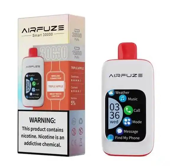 El Airfuze Smart 30k es un vape desechable de alta gama de 30,000 Puffs. Con una pantalla táctil y conexión Bluetooth, permite elegir entre 3 niveles de potencia para una vapeo a medida. Recargable por USB-C, ofrece funciones conectadas como reproducir música o hacer llamadas.