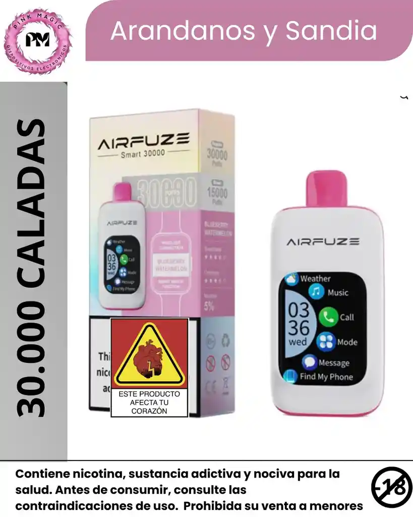 Airfuze Vape Smart 30.000 BLueberry Watermelon El AirFuze Vape Smart 30K es un vape recargable de alta gama que combina potencia, duración y funciones inteligentes. Ofrece hasta 30.000 puffadas, cuenta con una batería recargable de 900mAh y viene con 20 ml de e-liquid al 5% de nicotina, ideal para una experiencia intensa y satisfactoria.