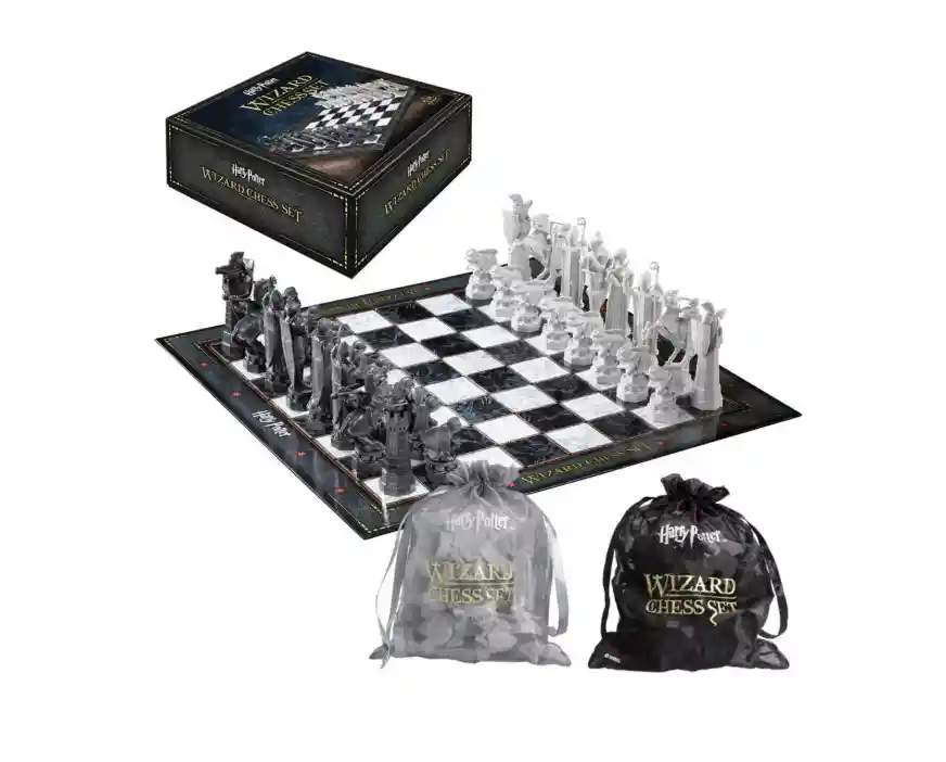 Incluye piezas de ajedrez y tablero de juego. Dimensiones del tablero de juego: 18.5 x 18.5 pulgadas. Altura de las piezas de ajedrez: de 2 a 4 pulgadas. Recreación en miniatura del juego de ajedrez del mago visto en Harry Potter y la piedra del brujo. Contiene 32 piezas de ajedrez, tablero de juego y dos bolsas con cordón.