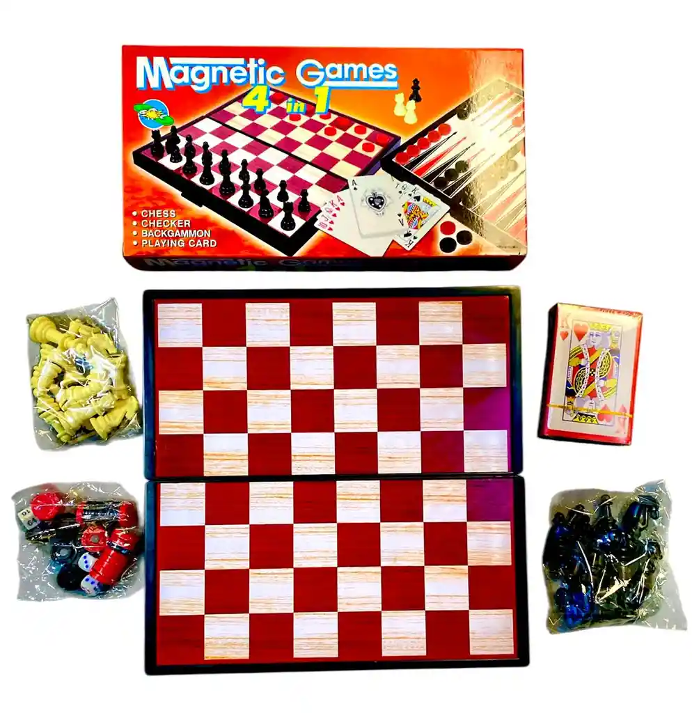 "Con nuestro juego 4 en 1 Ajedrez, dama, Bachgammon y naipe, con piezas imantadas, cada movimiento será fluido y preciso, ya que las piezas se adhieren al tablero con fuerza magnética, evitando cualquier deslizamiento o movimiento accidental. Esto significa que podrás disfrutar de partidas más intensas y estratégicas sin preocuparte por movimientos indeseados. Tablero Plegable Para Guardar Las Fichas. Las medidas del tablero son 24.5 cm x 24.5 cm ". Las medidas del tablero son 18 cm x 18 cm