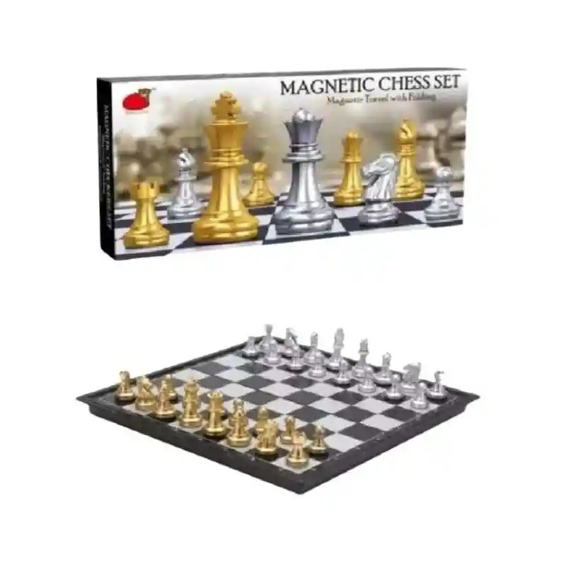 Juego de ajedrez con piezas magnéticas y acabado dorado elegante. Tablero plegable de 32x32 cm, ideal para jugar en casa o llevar a todas partes. Práctico, portátil y sofisticado.