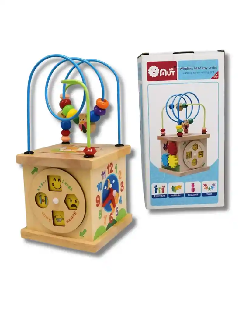 Fomenta el aprendizaje integral desde la primera infancia con este cubo interactivo de madera, parte de la serie “Winding Bead Toy”. Diseñado para niños a partir de los 3 años, este juguete combina actividades que estimulan la inteligencia emocional, la coordinación motora y el pensamiento lógico. 🌟 Características y Beneficios: - Reconocimiento emocional: Rueda giratoria con expresiones faciales como “Feliz”, “Triste”, “Enojado” y “Sorprendido” que ayuda a los niños a identificar y expresar sus emociones. - Aprendizaje del tiempo: Reloj analógico con manecillas móviles para practicar la lectura de horas y desarrollar nociones temporales. - Motricidad fina: Laberinto de cuentas en la parte superior que fortalece la coordinación ojo-mano y la destreza manual. - Pensamiento lógico y sensorial: Colores vivos, formas variadas y actividades que estimulan la curiosidad y el razonamiento. - Diseño Montessori: Promueve el juego autónomo, la exploración activa y el aprendizaje práctico. - Materiales seguros y duraderos: Madera ecológica con acabados suaves, ideal para uso infantil.