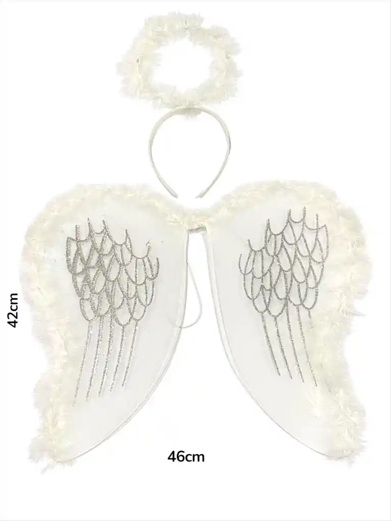 Alas de ángel color blanco con detalles escarchados en color plateado y bordes en plumas. con diadema. Sus medidas aproximadas son 46 cm de ancho x 42 cm de alto. Ref. 0200