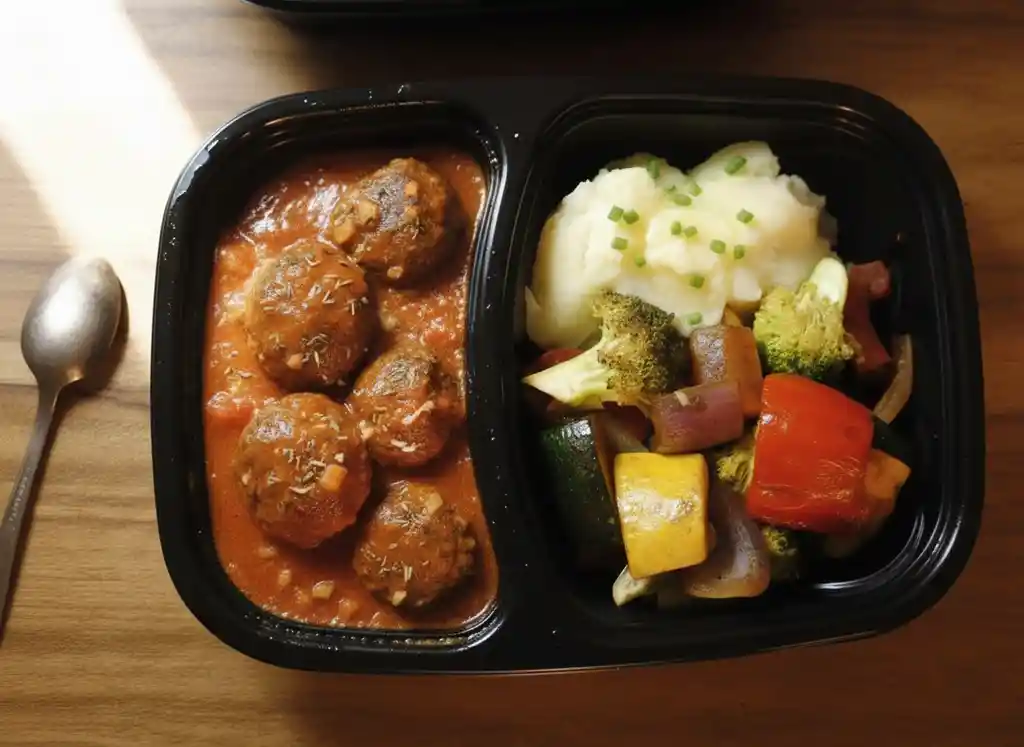 Comida congelada lista para calentar: Ingredientes: Carne de res molida, Papa pastusa, tomate, Zucchini amarillo, Zucchini verde, Brócoli, cebolla cabezona blanca, pimentón rojo, Cebolla cabezona roja, salsa de tomate, salsa soja, Crema de leche, salsa inglesa, Aceite vegetal, mayonesa, ajo natural, sal, Caldo de costilla, paprika, perejil, laurel, pimienta negra.