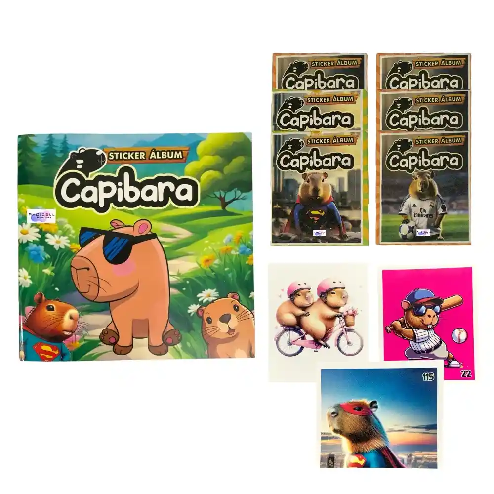 Álbum Capibara + Láminas Autoadhesivas Incluye: - 1 Álbum ilustrado - 50 sobres con láminas (entre 100 y 120 láminas autoadhesivas en total) Características del álbum: - 24 páginas - Pasta blanda - Medidas: 17 cm alto x 12 cm ancho Nota: Marca genérica, no son colección Panini.