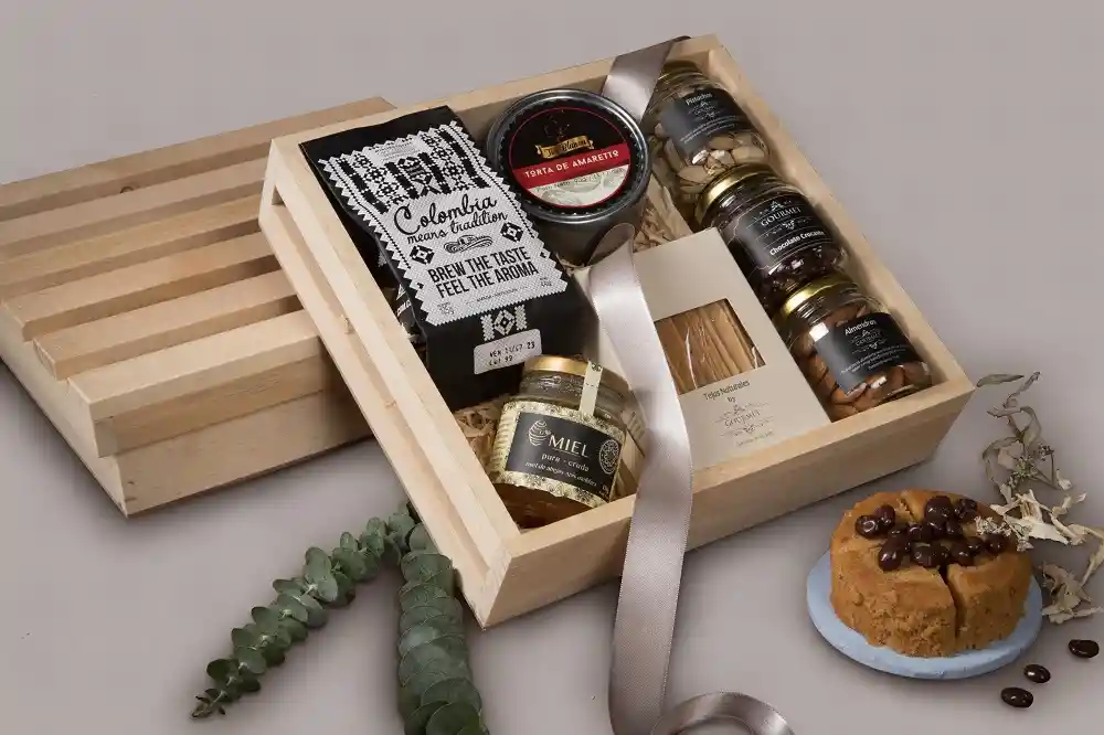 Café 100% colombiano (125g), miel artesanal (130ml), torta de amaretto (150g), tejas naturales (90g), almendras (40g aprox), chocolate crocante (40g aprox) y pistachos con sal (40g aprox).
