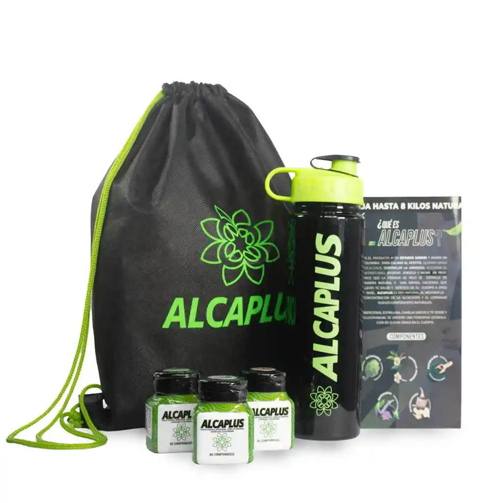 Contenido del KIT; - 5 Frascos de ALCAPLUS para bajar de peso (cada frascos contiene 60 pastillas). - 1 Tula - 1 Obsequio ( Termo, Shaker, Alcancía.) - 1 Folleto informativo.