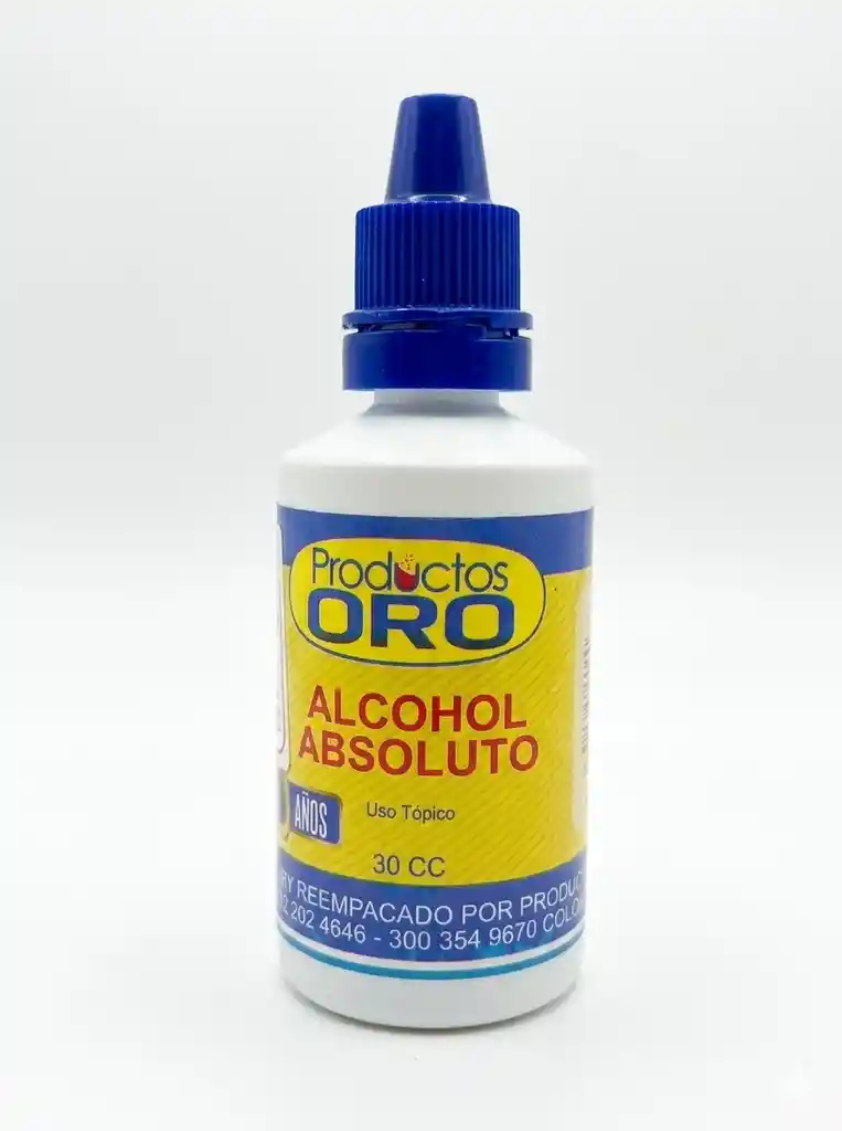 Descripción: Alcohol absoluto de alta pureza para uso tópico. Ideal para la desinfección de la piel intacta y como antiséptico de uso externo en el hogar o entornos clínicos. Contenido: 30 cc. Uso: Tópico / Externo.