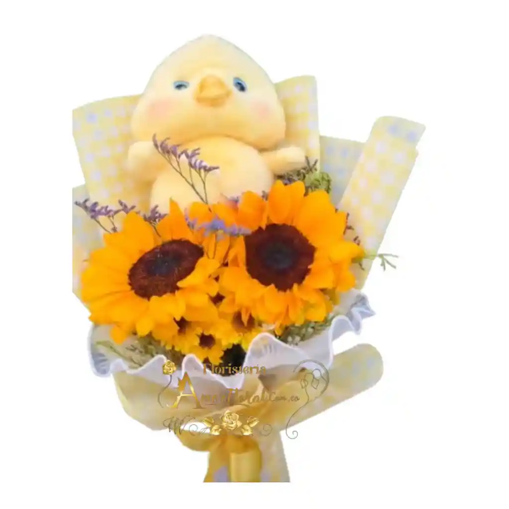 bouquet por 2 girasoles y peluche pequeño, si deseas un mensaje para la tarjeta lo puedes dejar escrito en el área de observaciones o escribirnos al whatsapp al 3143111616 y enviarnos el mensaje para la tarjeta.