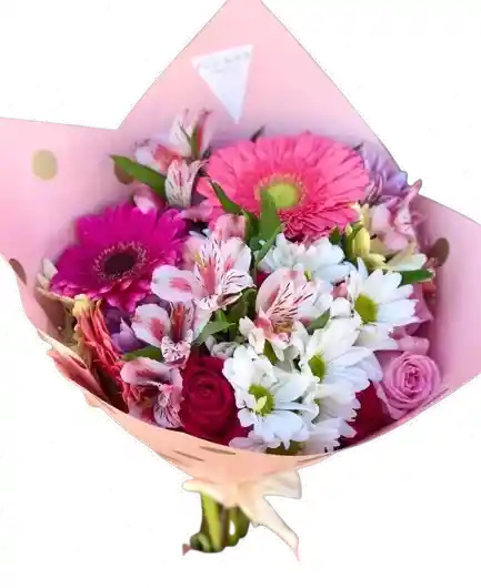 Bouquet floral con gerberas, rosas y flores mixtas en tonos rosados y blancos, diseñado para transmitir frescura, alegría y delicadeza. Su combinación de colores crea un arreglo moderno y encantador, ideal para sorprender en cualquier ocasión. Algunas flores pueden variar sutilmente según la temporada, manteniendo siempre la armonía, el diseño y el valor del arreglo. Incluye tarjeta personalizada sin costo para acompañar tu mensaje especial. 🌸💌