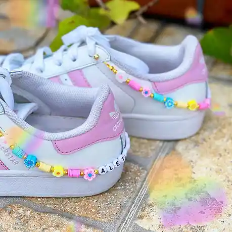 Straps para tennis hecho de mostacillas de colores pasteles y dijes aesthetic de flores. *Puedes personalizarlos con tú nombre!! *Medida: 30 cm cada uno!!
