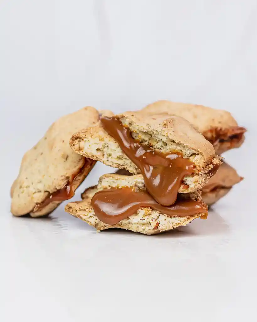 Elaborado con harina de avena, avena en hojuelas, endulzado con Stevia, mantequilla clarificada, huevos y arequipe sin azúcar.