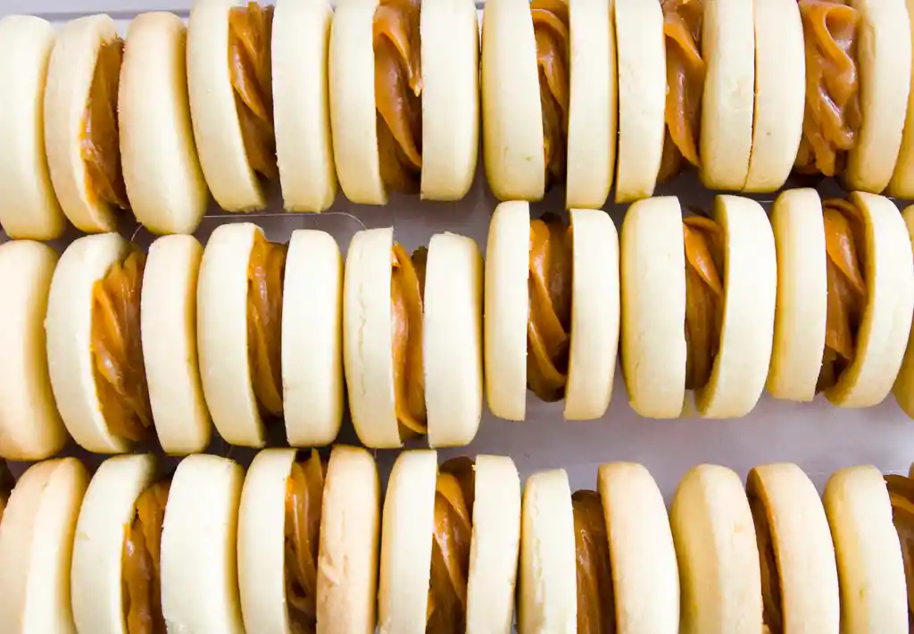 Deliciosos mini alfajores polvorosos, rellenos de arequipe y espolvoreados con azúcar glas. Caja por 12 unds