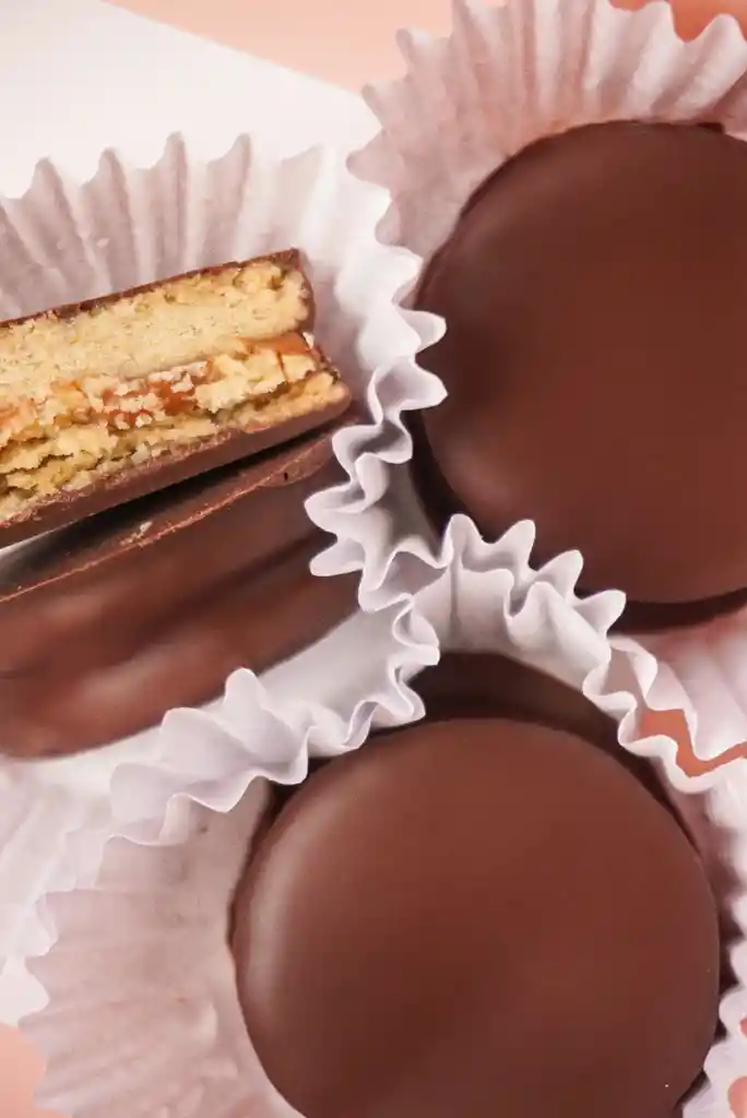 6 alfajores rellenos de arequipe y cubiertos de chocolate al 60%. sin azúcar añadida.