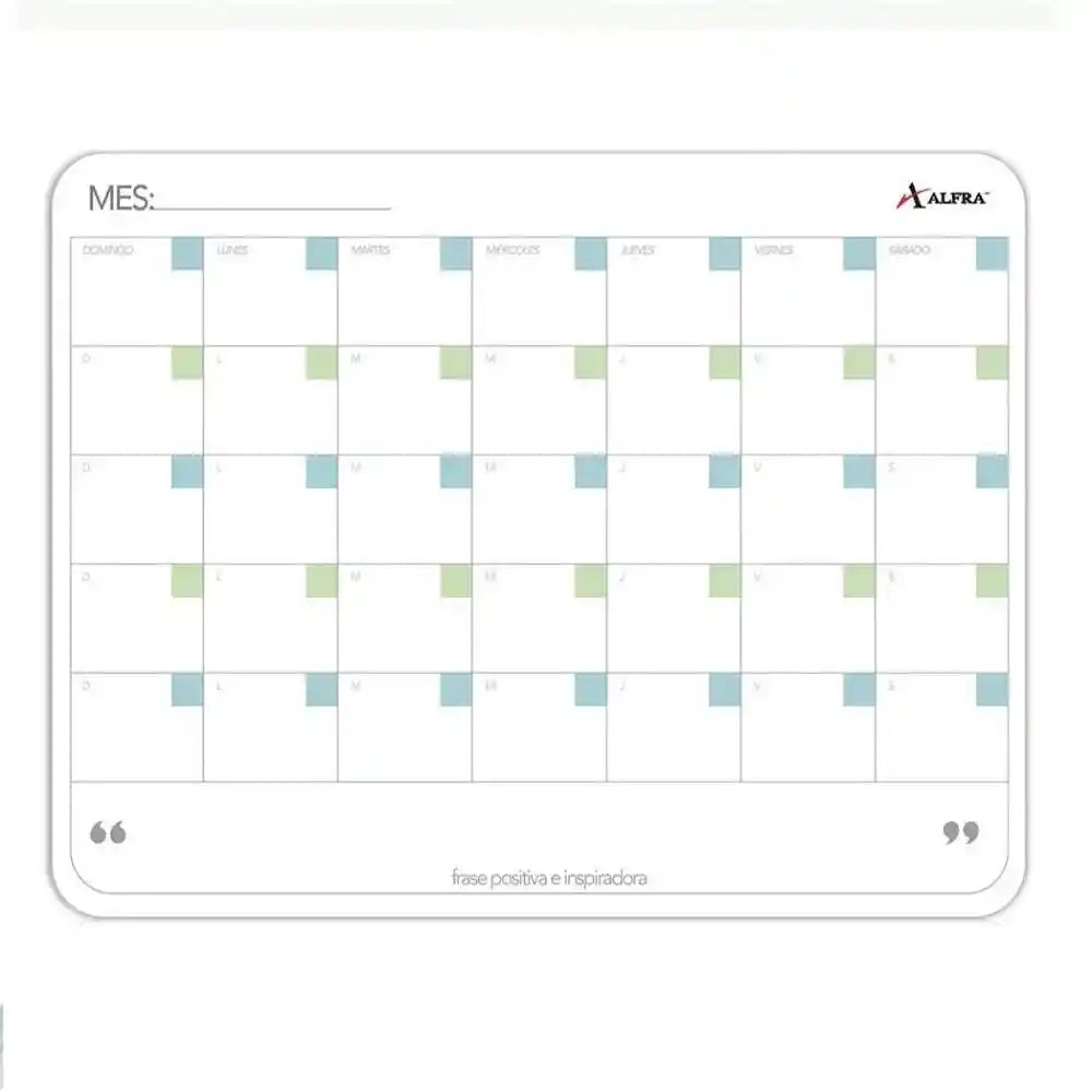 Tablero Pintagenda Mensual con superficie blanca, para el uso de marcadores de borrado en seco. Seccionada con los días del mes. Sujeción por medio de ojillo. Medidas: 30 x 40 cm. Ideal para Oficina, Hogar, Estudio y Negocios