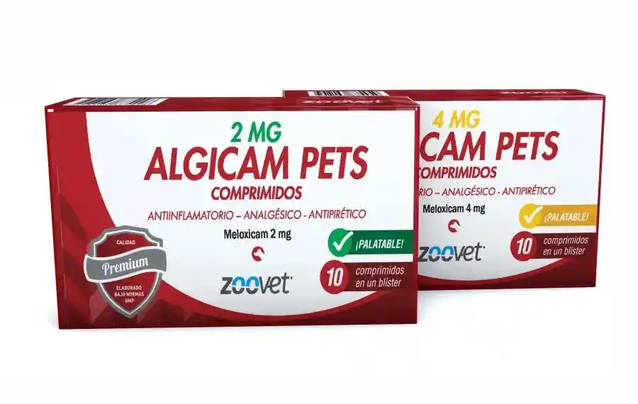 Antiinflamatorio - Analgésico Fórmula: Cada comprimido contiene: Meloxicam 2 mg o Meloxicam 4 mg. Indicaciones: Alivio de la inflamación y el dolor en trastornos músculo-esqueléticos agudos y crónicos. Tratamiento y prevención del dolor postquirúrgico. Uso en caninos. Dosis: Comprimidos de 2 mg: Primer día: 1 comprimido cada 10 kg de peso (equivalente a 0,2 mg/kg). Luego administrar ½ comprimido cada 10 kg de peso (equivalente a 0,1 mg/kg), cada 24 hs. Comprimidos de 4 mg: Primer día: 1 comprimido cada 20 kg de peso (equivalente a 0,2 mg/kg). Luego administrar ½ comprimido cada 20 kg de peso (equivalente a 0,1 mg/kg), cada 24 hs. Duración del tratamiento: Según criterio veterinario. Presentación: Caja premium conteniendo blíster por 10 comprimidos.